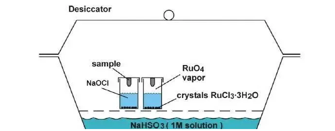 先用雙面膠把樣品塊粘在一個10mL的玻璃小瓶上部,放入少量RuCl3在瓶子底部,用槍加入雙倍的NaClO,蓋上蓋子,反應會立即開始。將玻璃小瓶放在干燥器里,最好在加NaClO溶液之前就放在干燥器里。干燥器底部放有一定量的1M NaHSO3溶液,用以吸收多余的RuO4蒸汽。染色完畢后,樣品用水沖洗至少1小時,干燥后切片。