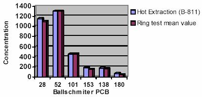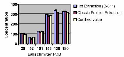 我們比較了采用 Buchi B-811 萃取儀(熱萃取模式)和采用索氏標(biāo)準(zhǔn)法進(jìn)行淤泥中的PCB 和PCDD/F 測定。在測定PCB 時我們采用標(biāo)準(zhǔn)淤泥(0.1-0.4mg/kg),并采用環(huán)形測試材料(0.07-1.2mg/kg)。淤泥中的毒素含量約為46ng TEQ/kg。我們比較了采用兩種不同的方法,索氏標(biāo)準(zhǔn)法和熱萃取法進(jìn)行對比。采用Buchi公司的B-811萃取儀中的熱萃取模式可以大大縮短萃取時間,減少所需要的溶劑量,并且溶劑可以重復(fù)使用至少3-4次,大大提高了效率,節(jié)約了成本。